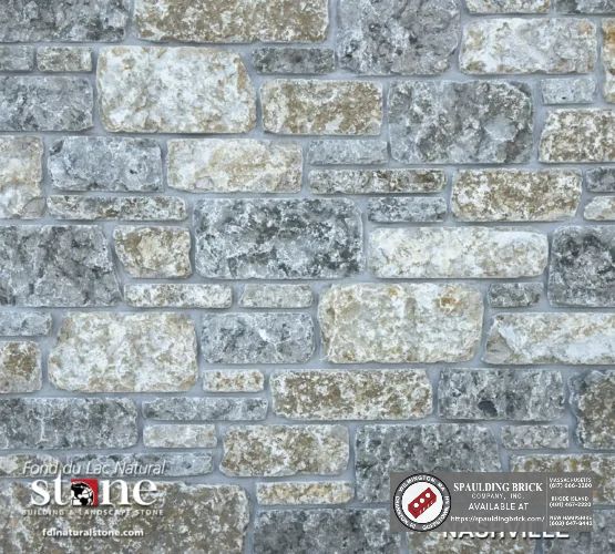 Nashville is a natural thin veneer stone made by Fond Du Lac and sold by Spaulding Brick Company, Inc. in New England. It is a tan/gray stone in a square and rectangle pattern.